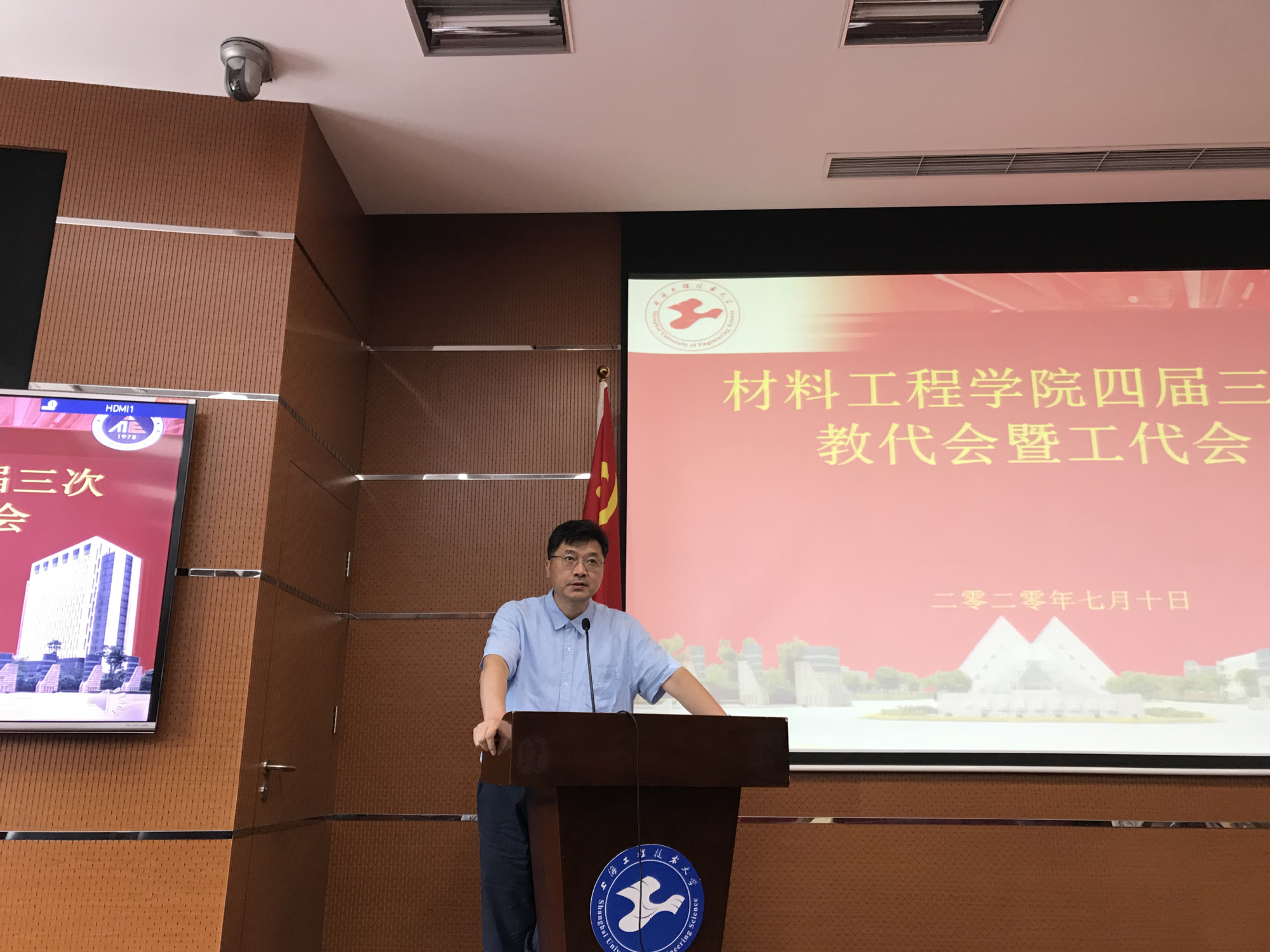 7月10日下午,材料工程学院在航飞楼一楼报告厅举行材料工程学院第四届第三次教代会暨工代会(简称“双代会”)。参加会议的有校工会常务副主席柳如荣、材料工程学院党政负责人、教代会代表、列席代表等。会议由学院工会主席冷培榆主持。